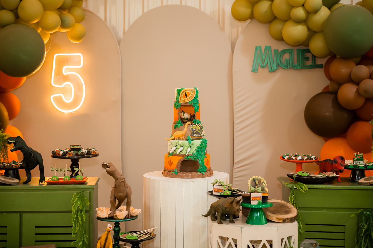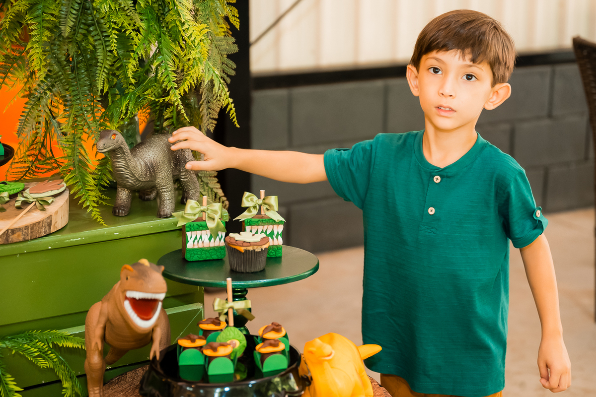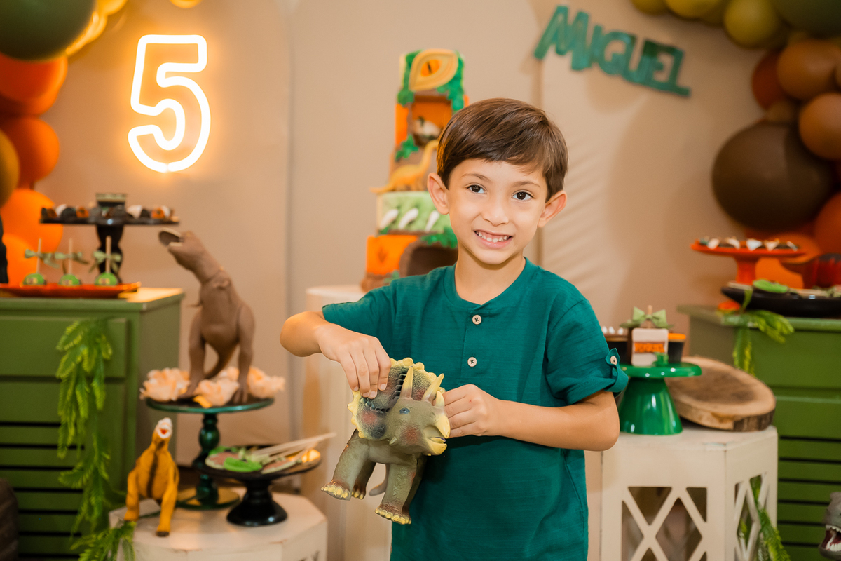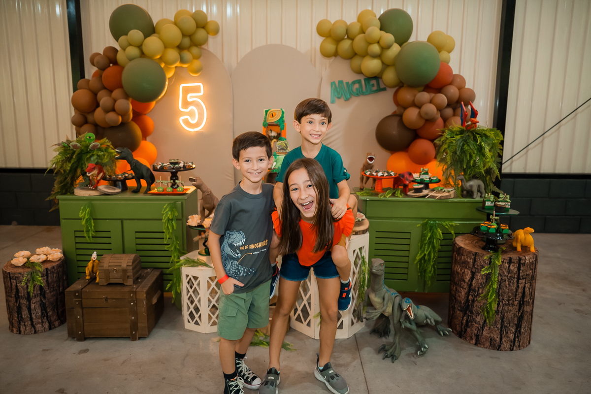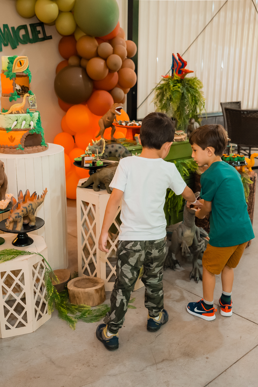 O Aniversário do Miguel foi do jeitinho que ele gosta: Muitos amigos e muitos dinossauros ferozes.