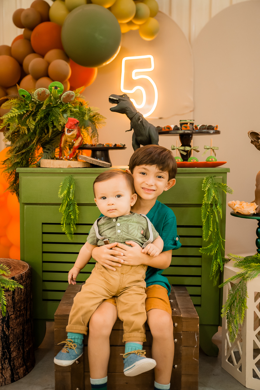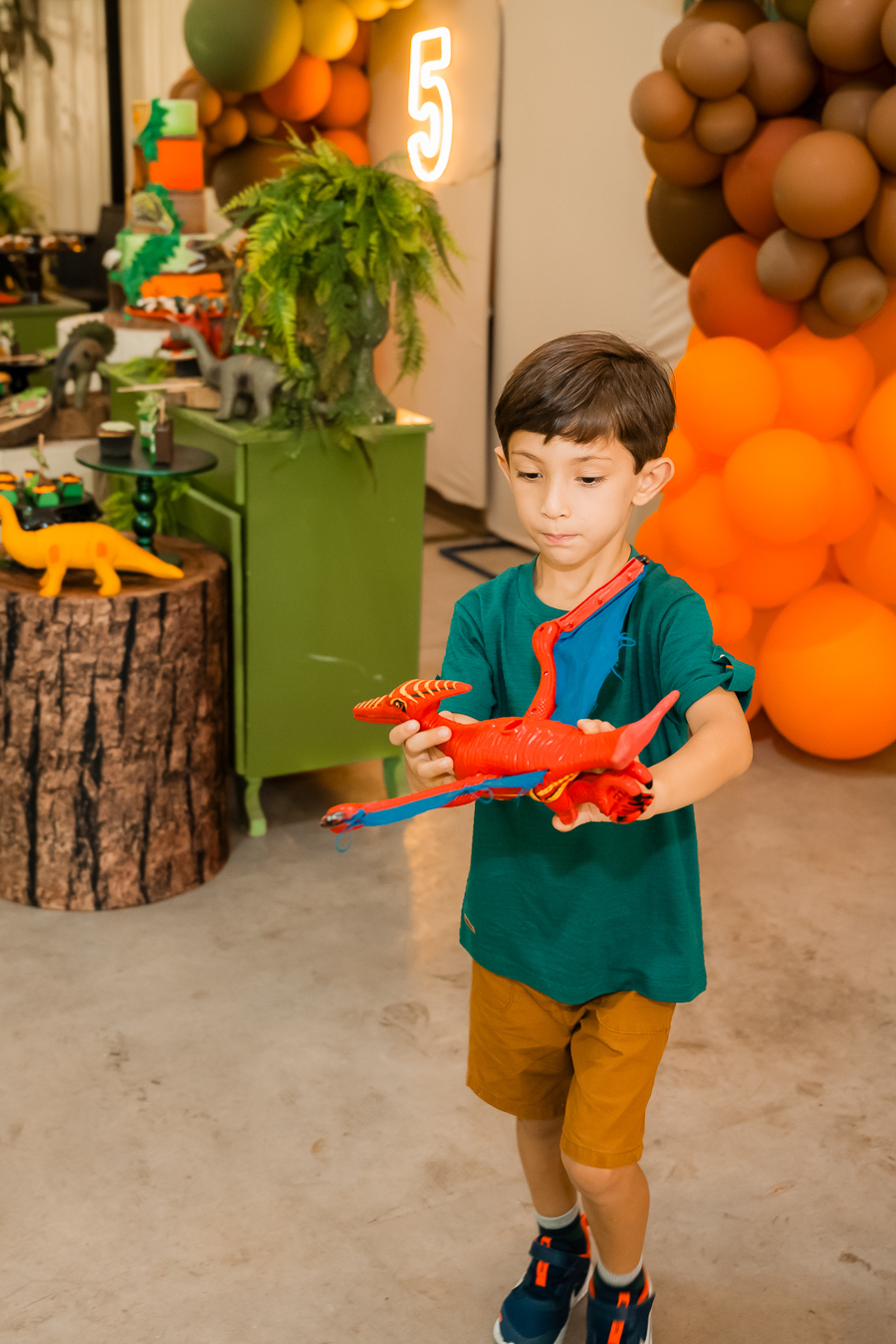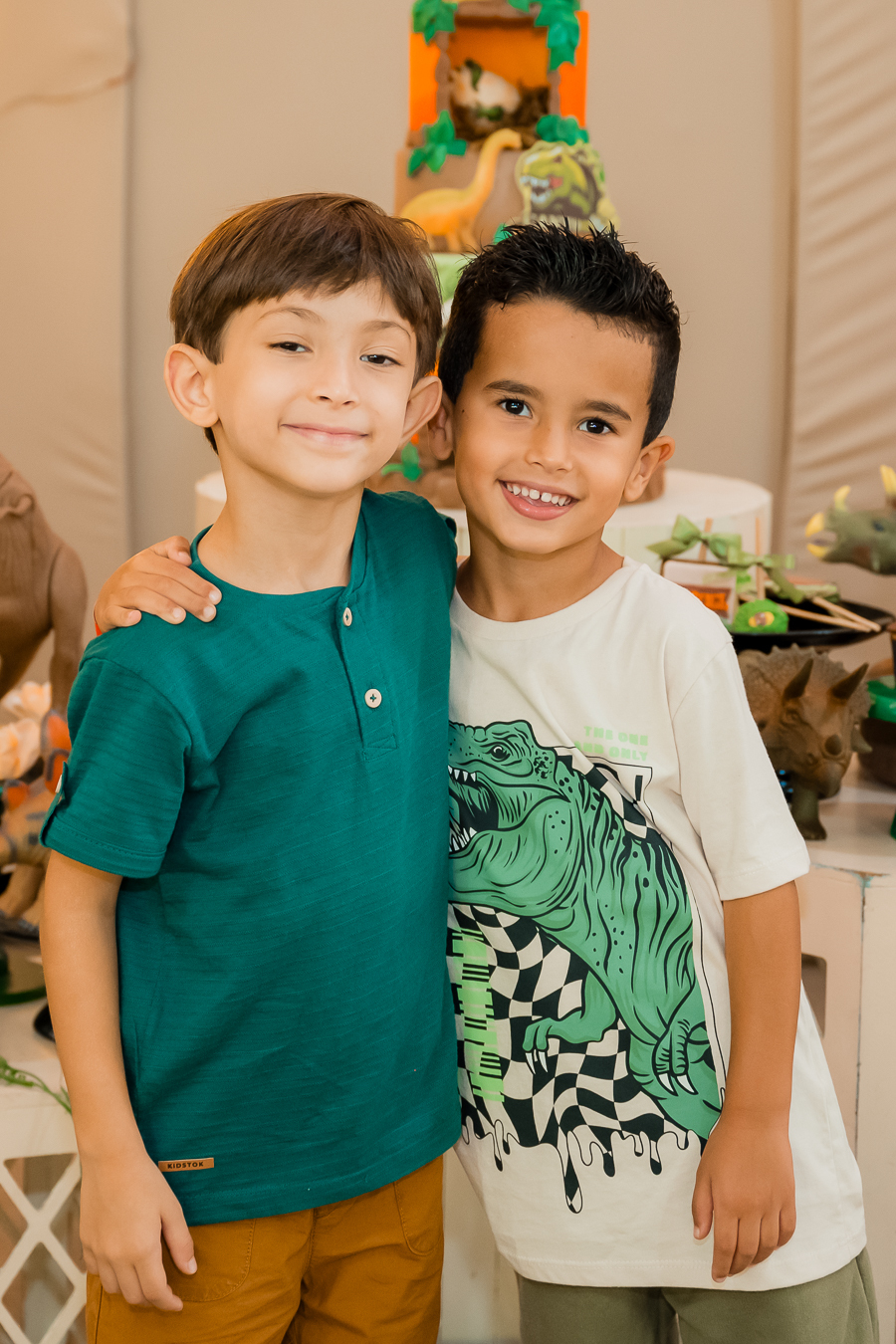 O Aniversário do Miguel foi do jeitinho que ele gosta: Muitos amigos e muitos dinossauros ferozes.