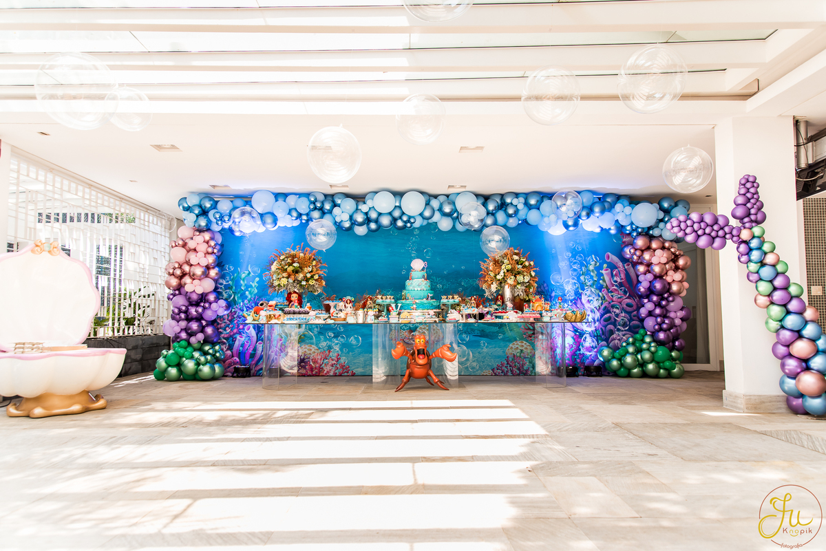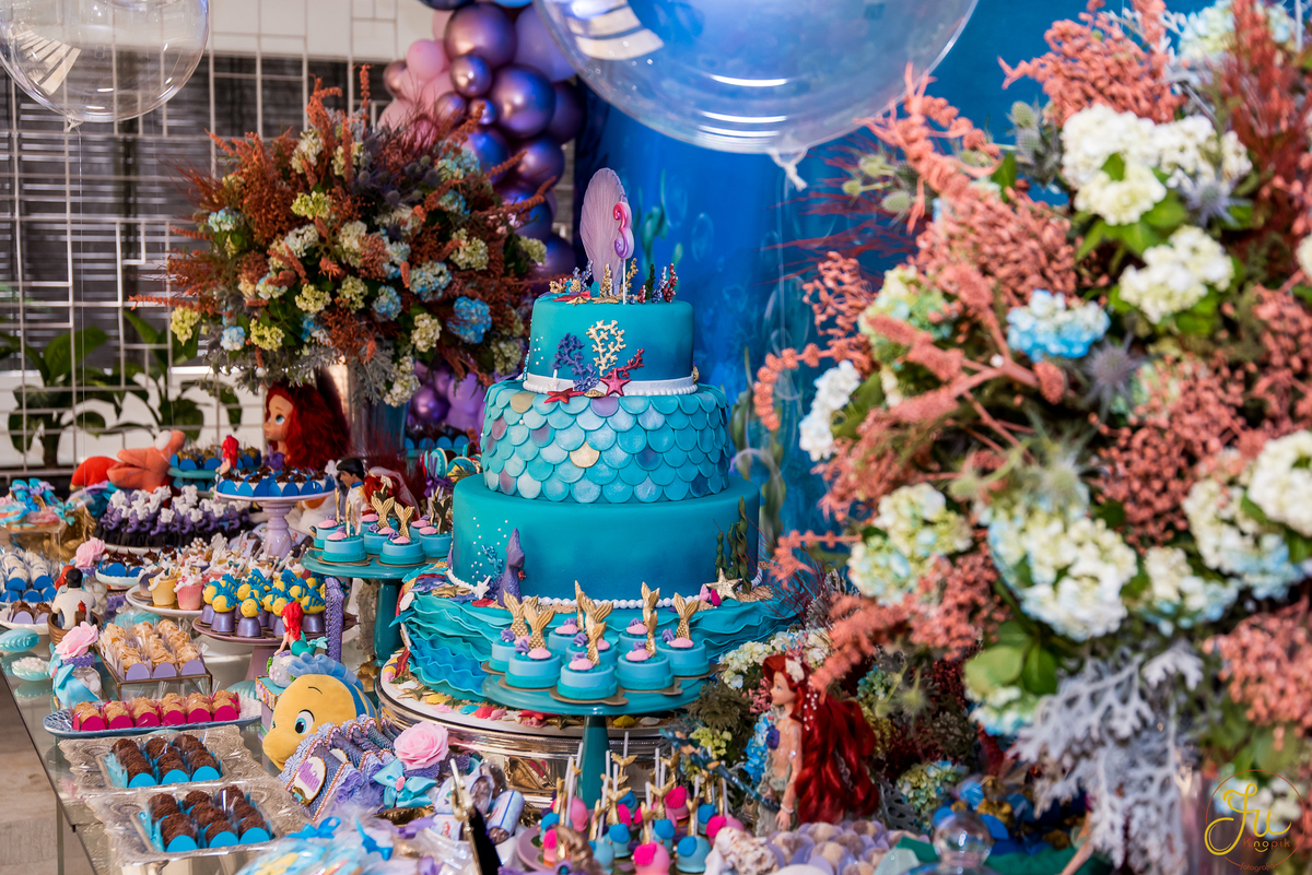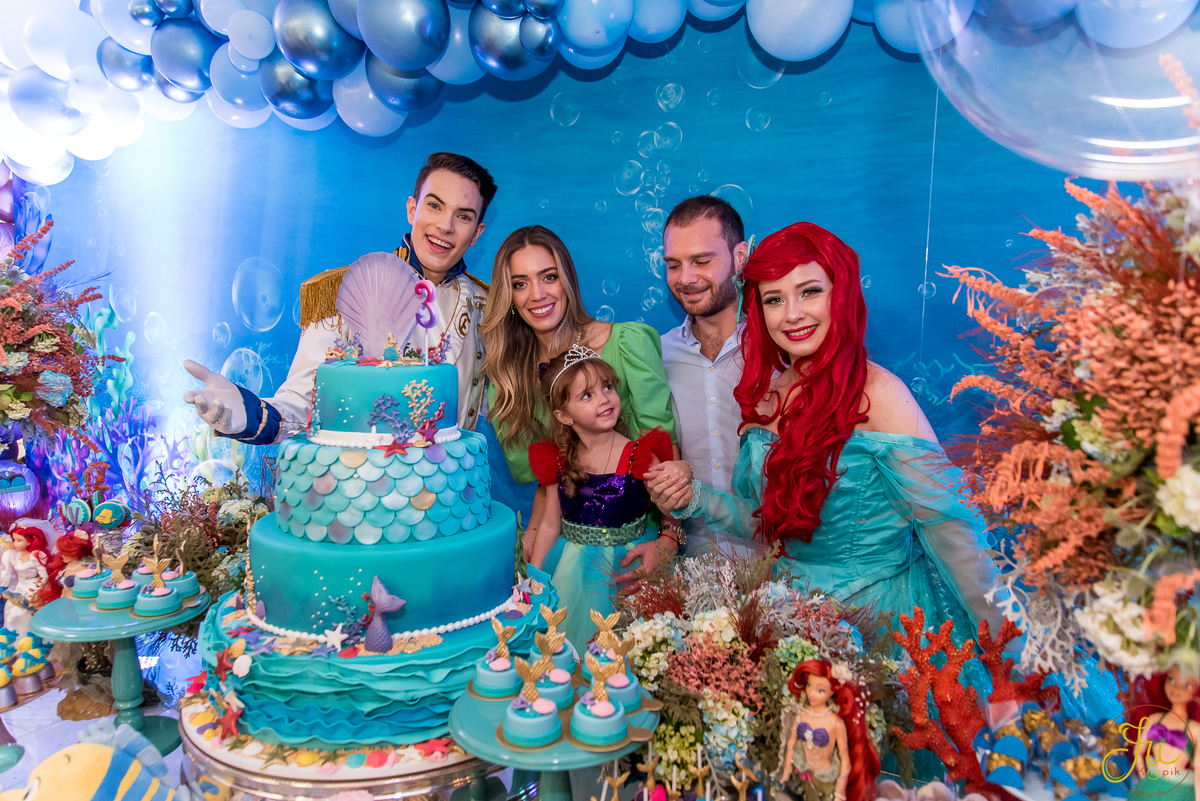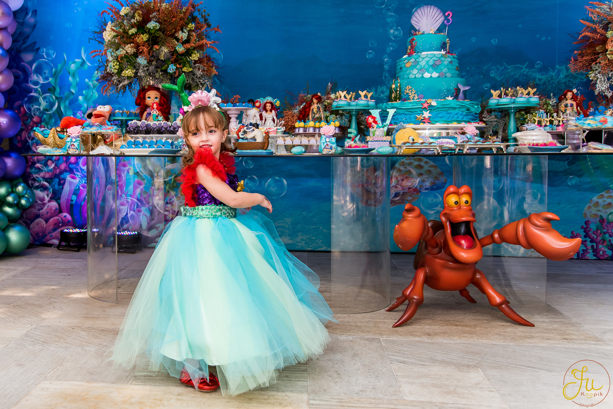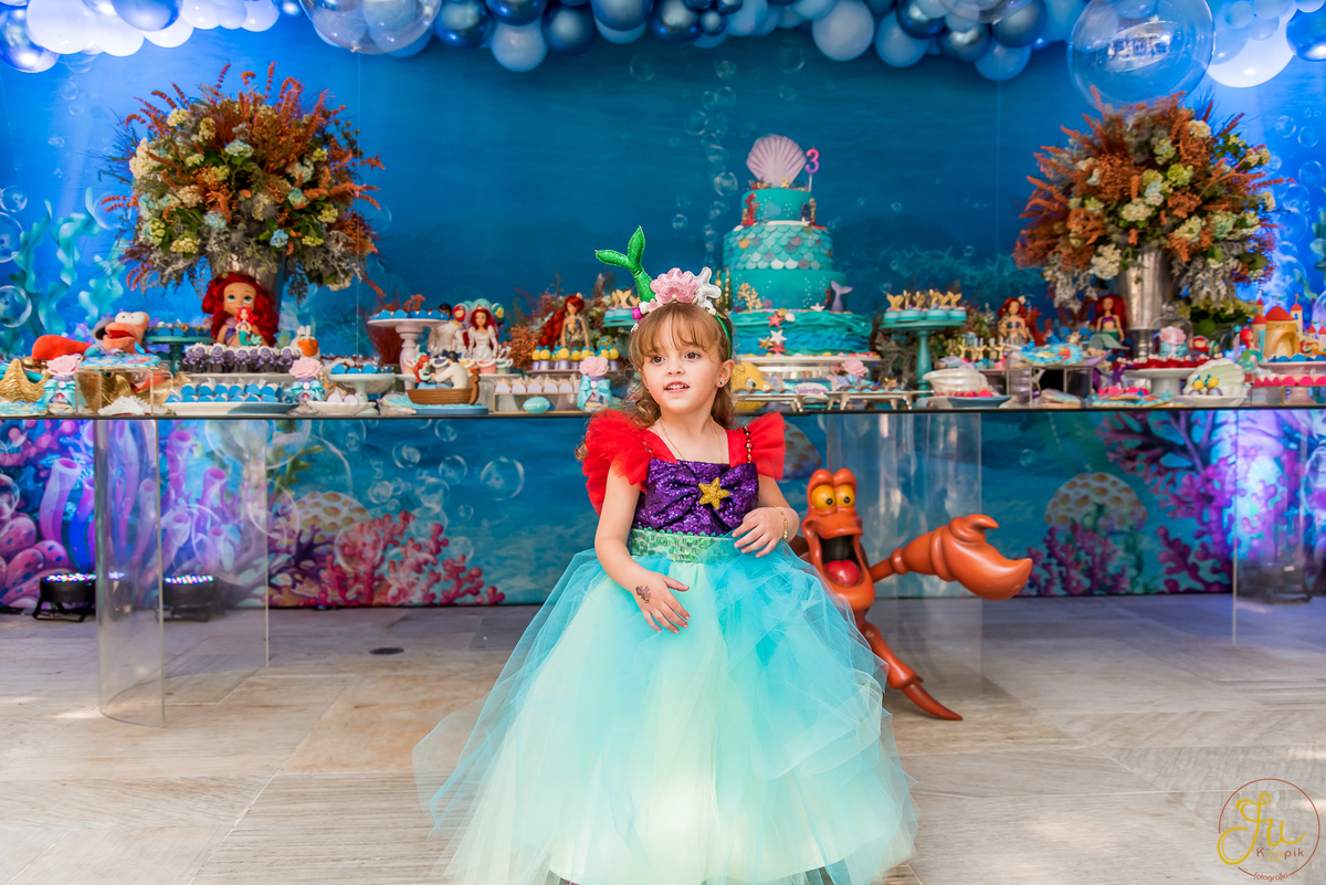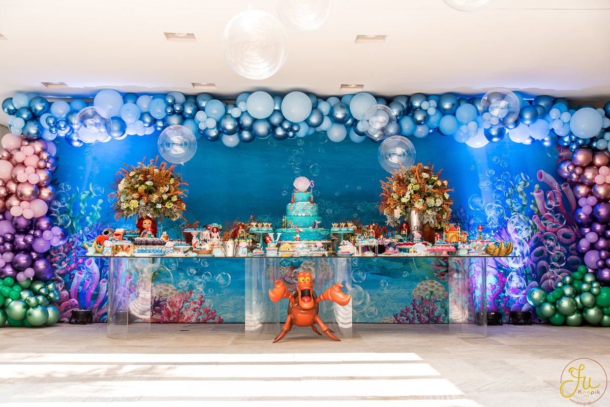 Uma Festa Sereia, com cores lindas e vibrantes e com a participação exclusiva da própria Ariel e seus amigos, diretamente lá do fundo do mar!
