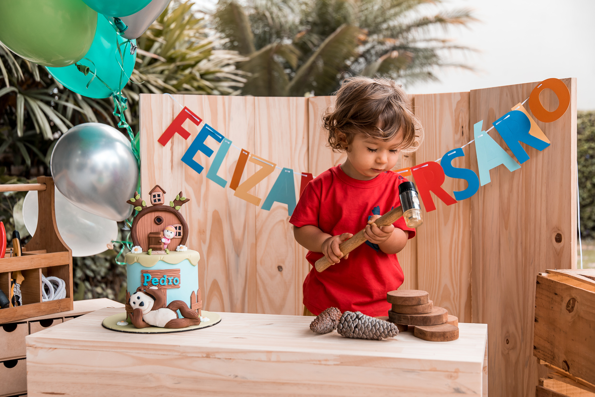 O tema para comemoração dos seus dois aninhos de idade foi Masha e o Urso e os papais prepararam uma bancada com as coisinhas que o Pedro mais gosta de brincar: Ferramentas,